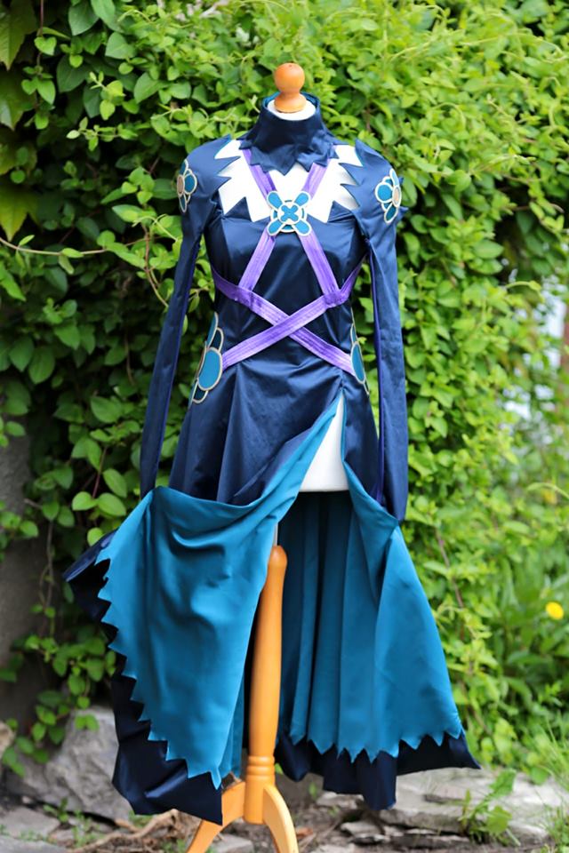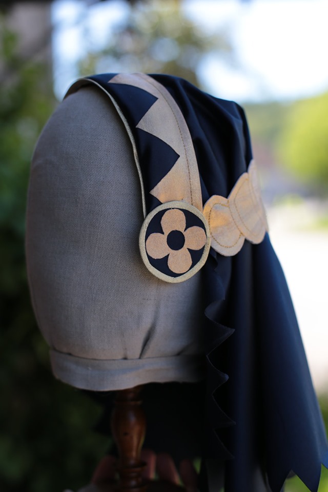 Robe satin extensible, doublure satin, motifs appliqués satin finition passepoil or, coiffe satin extensible finition appliqués or, col satin extensible entièrement doublé, gants satin extensible, bas satin extensible (non photographié). Lavable machine.