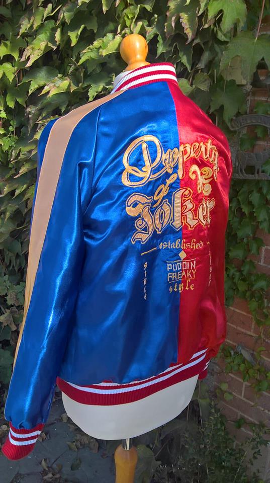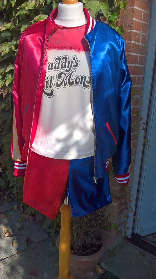 Blouson satin avec dos brodé, entièrement doublé, t-shirt élasthanne peint à la main avec transfert et broderie, short élasthanne pailleté . Lavable machine.
