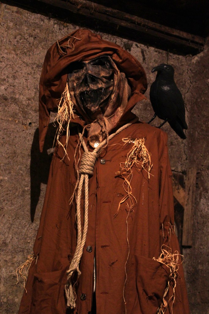 Ensemble comprenant manteau et chapeau en coton lacéré et rembourrage raphia, masque en toile de jute modelée, durcie et peinte avec ajout de fil de fer, corde de pendu avec noeud coulant, corbeau plastique fixé sur épaule.