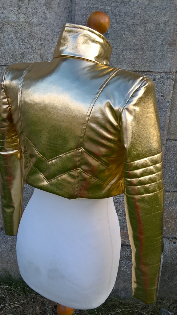 Ensemble entièrement sur mesure, blouson surpiqué en lycra laqué or doublé satin or avec poche intérieure, bustier blanc gansé noir et caleçon en lycra mat, gant violet en lycra laqué gansé noir. Ceinture en lycra laqué or avec boucle plastique or. Attention, ensemble entièrement lavable en machine à 30 ° cycle délicat sauf ceinture.