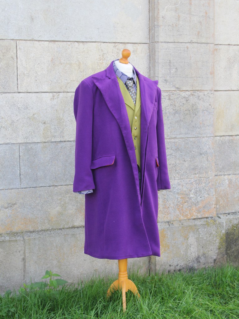 Cosplay 5 pièces composé d’un manteau en lainage violet entièrement doublé de satin orange, d’un pantalon classique violet (non photographié), d’un gilet vert olive dos gris, doublé satin orange, d’une chemise en coton et d’une cravate.