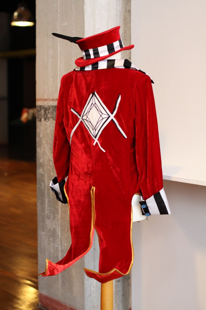 Cosplay comprenant une veste queue de pie en velours rouge gansée de satin or, poignets et col satin rayé, motif dos entièrement rebrodé, chapeau velours et satin rayé avec plume et carte à jouer. L’ensemble réalisé sur mesure est entièrement doublé de satin.