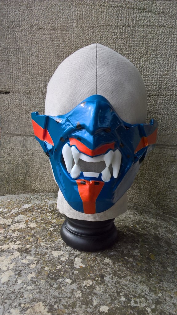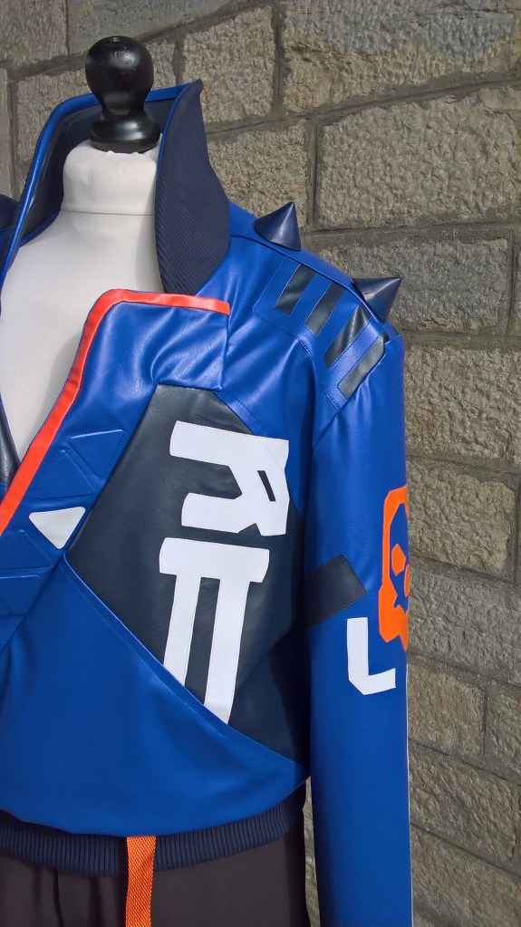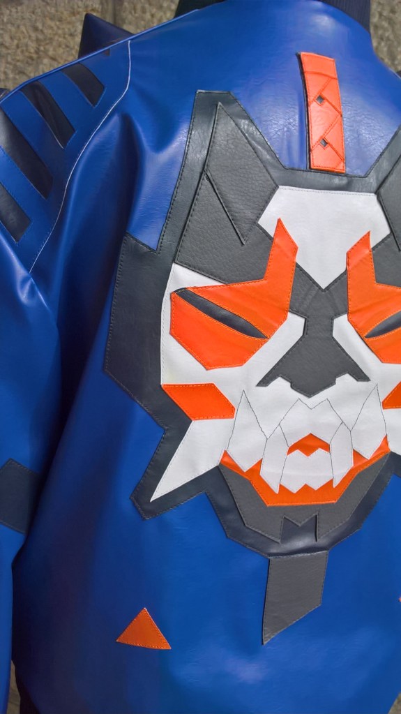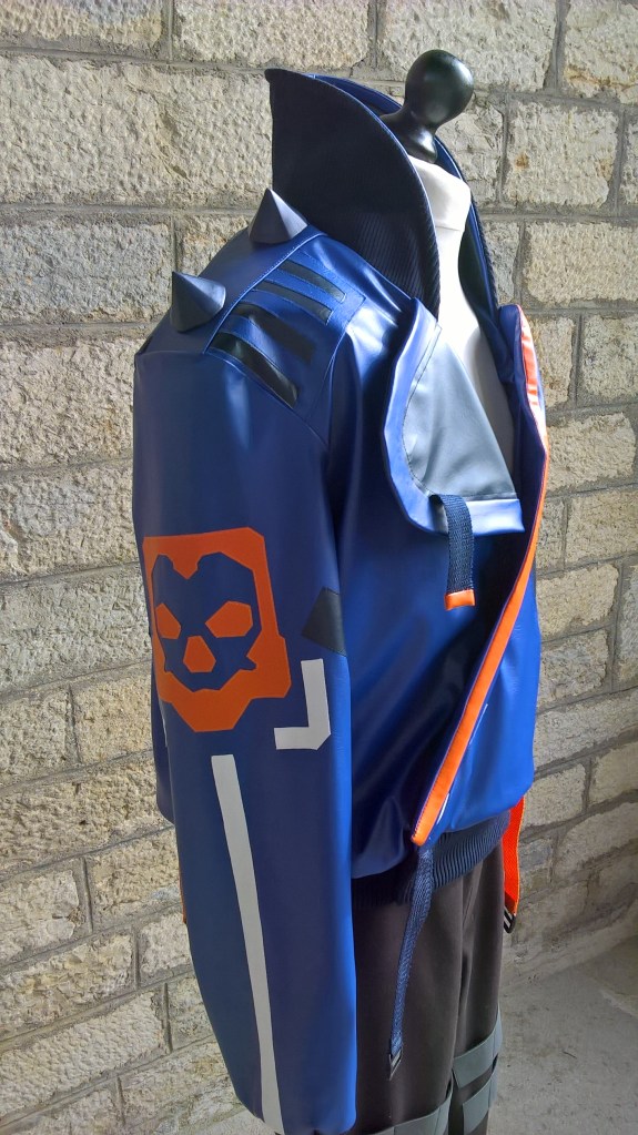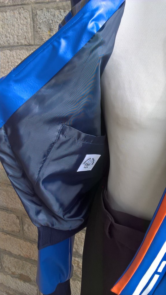Ensemble composé d’un blouson en simili-cuir entièrement doublé avec poches intérieures, pointes épaules amovibles (pour faciliter l’entretien), d’un pantalon en gabardine avec empiècements simili-cuir et d’un masque en mousse Eva.