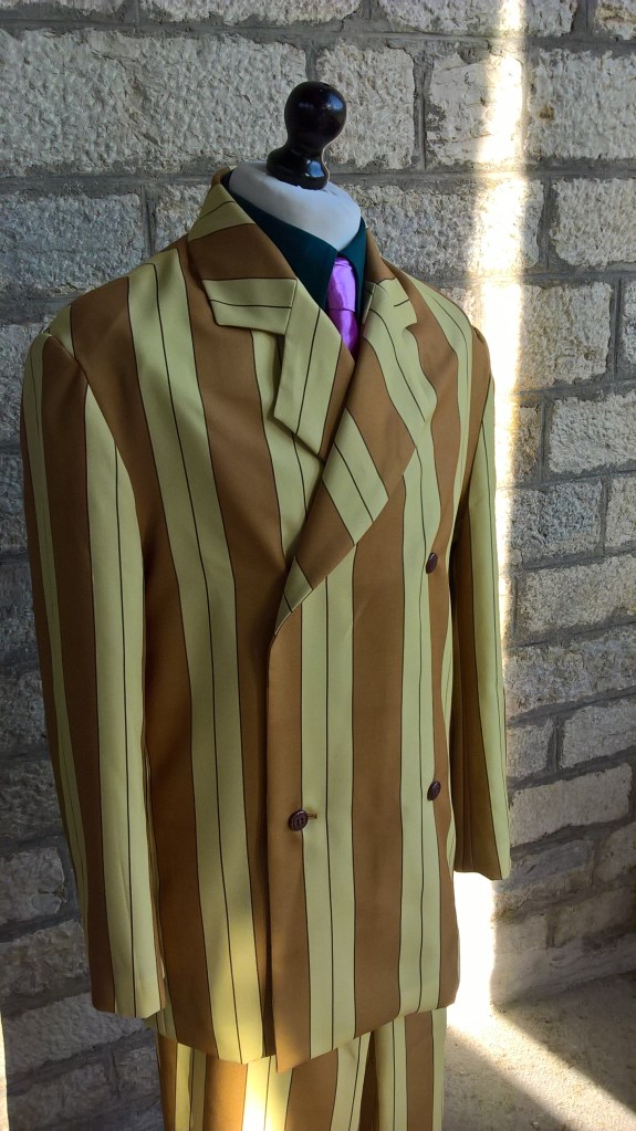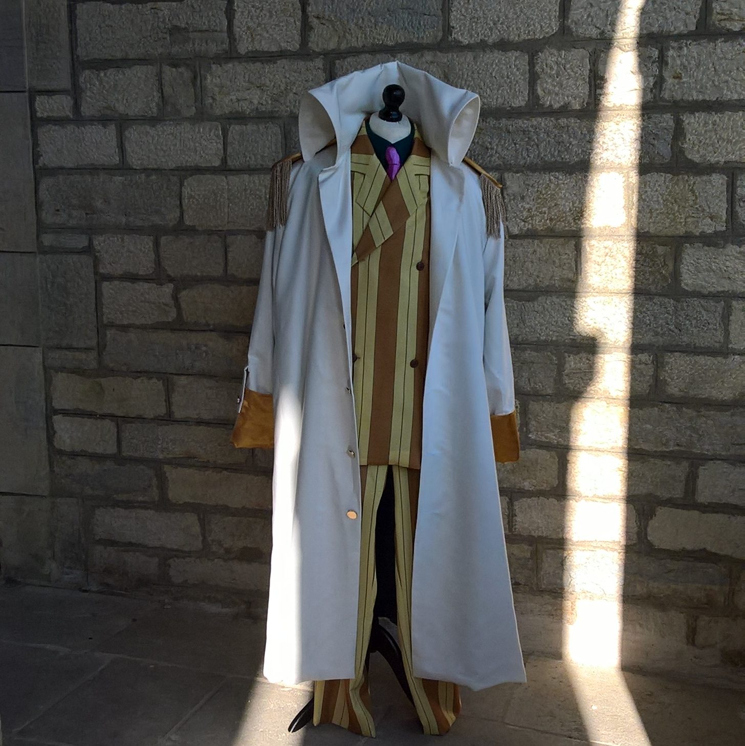 Ensemble comprenant un manteau-cape blanc entièrement doublé avec épaulettes amovibles idéogramme dos en satin rebrodé, poches invisibles côtés et intérieures, un costume deux pièces (veste intégralement doublée avec poches intérieures + pantalon), chemise et cravate.