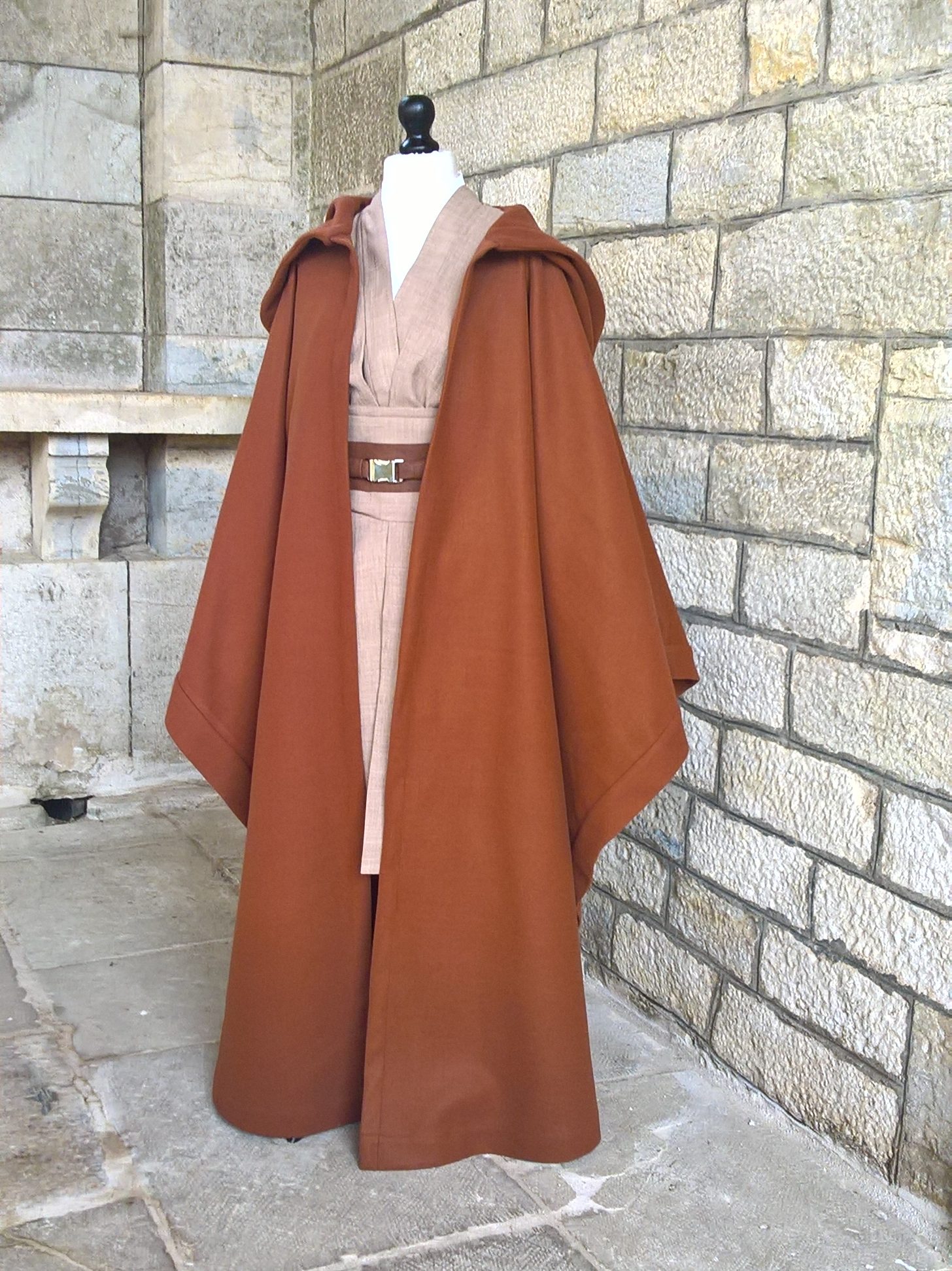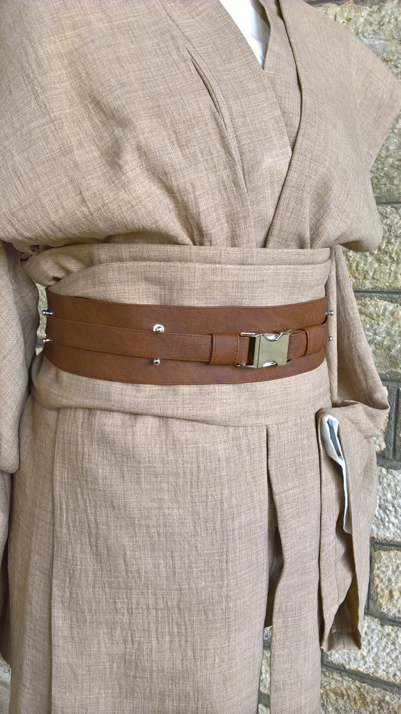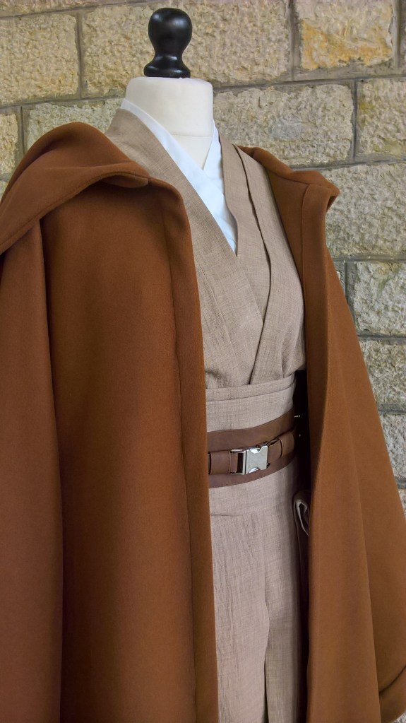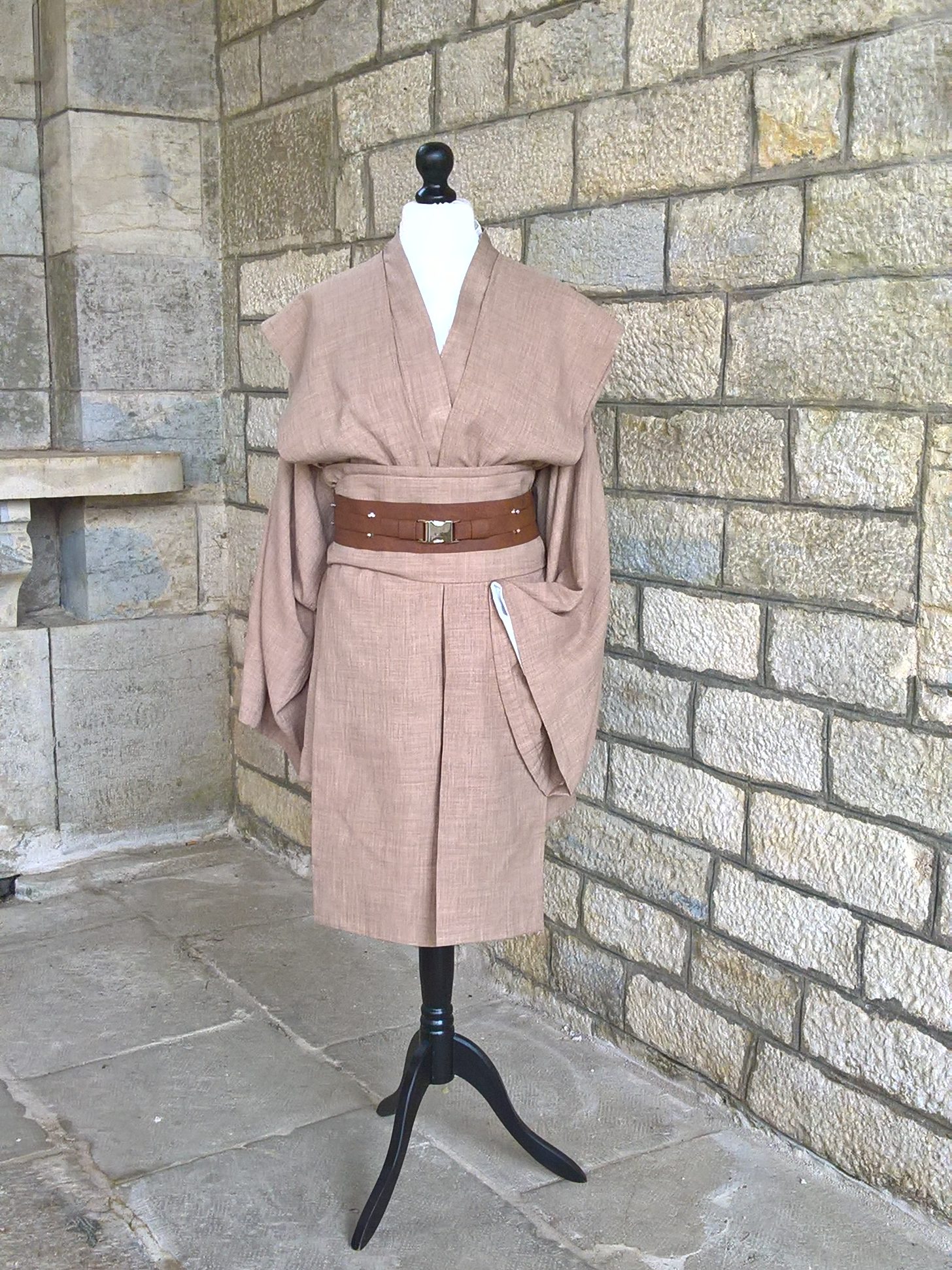 Ensemble comprenant bure en drap de laine avec poches invisibles côté, kimono et tabard en lin, ceinture simili-cuir, chemise popeline de coton et pantalon en gabardine de coton (non photographié).