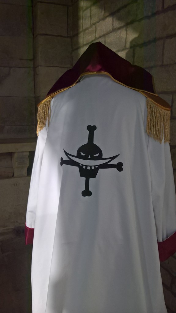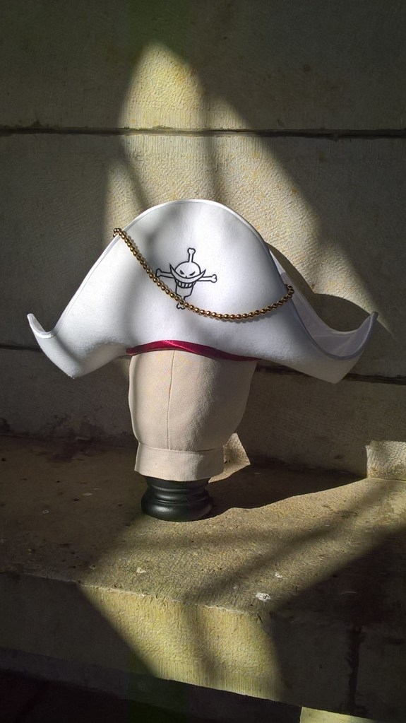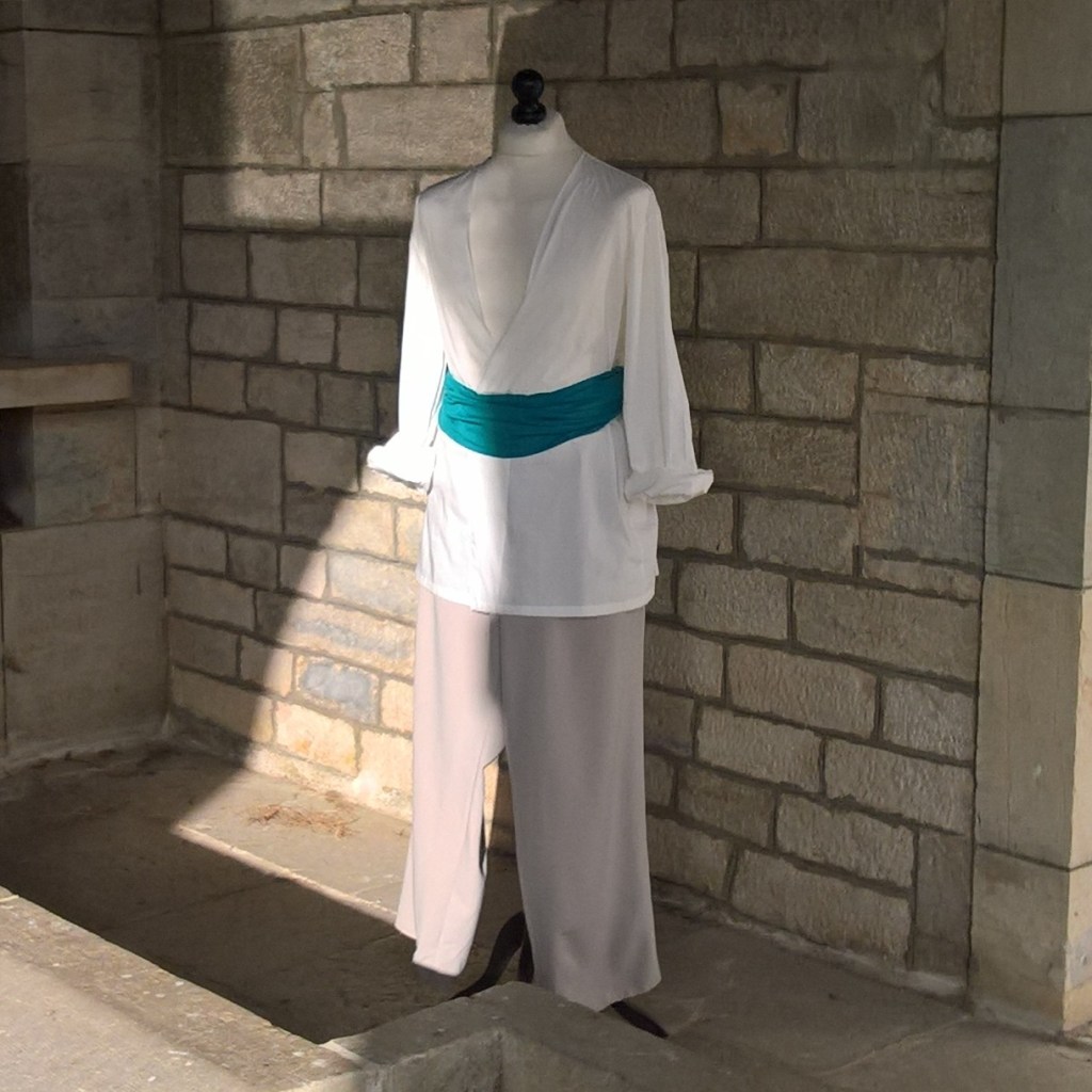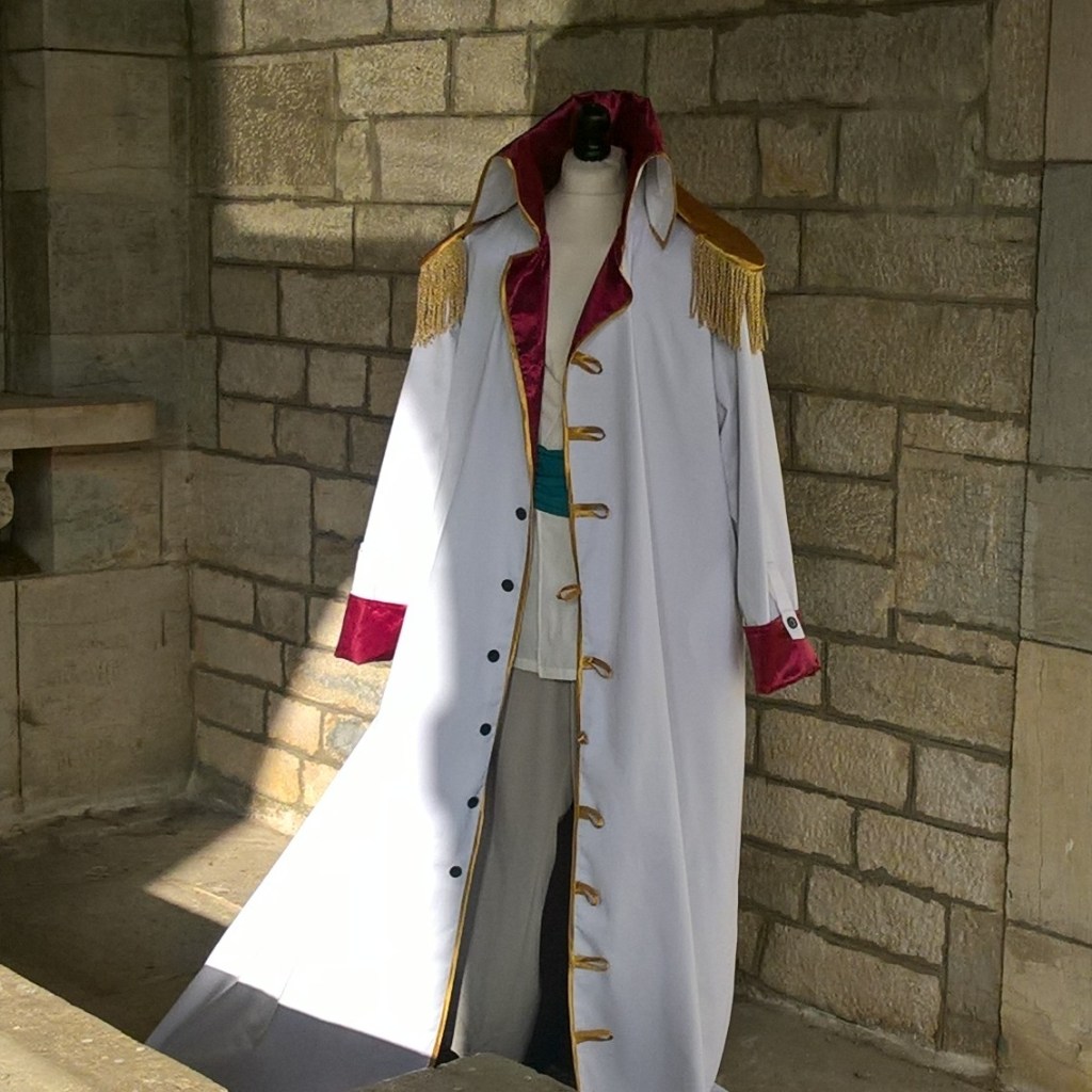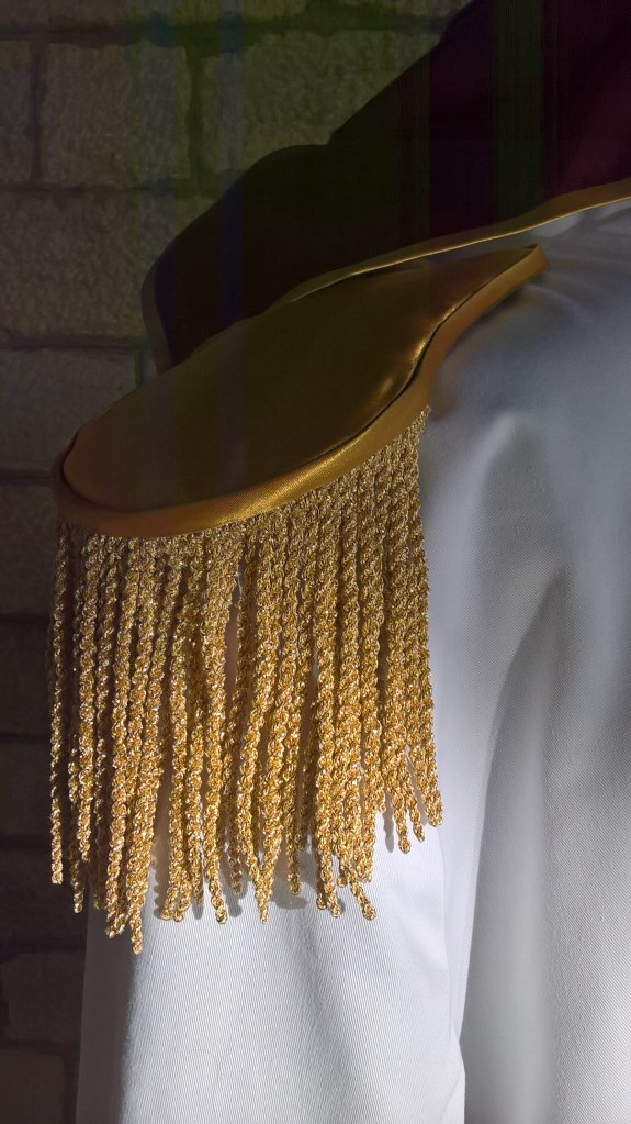 Ensemble comprenant manteau blanc en sergé de coton gansé or entièrement doublé satin avec poches invisibles côtés et épaulettes amovibles à franges faites main, tunique en popeline de coton, ceinture écharpe coton, pantalon gabardine de coton et chapeau feutre rebrodé gansé satin. Le symbole dos est en satin rebrodé.